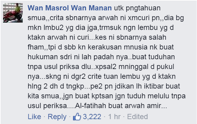 Wan Masrol Wan Manan : utk pngtahuan smua,,crita sbnarnya arwah ni xmcuri pn,,dia bg mkn lmbu2 yg dia jga,trmsuk ngn lembu yg d ktakn arwah ni curi...kes ni sbnarnya salah fham,,tpi d sbb kn kerakusan mnusia nk buat hukuman sdri ni lah padah nya..buat tuduhan tnpa usul priksa dlu..xpsal2 mninggal d pukul nya...skng ni dgr2 crite tuan lembu yg d ktakn hlng 2 dh d tngkp...pe2 pn jdikan lh iktibar buat kita smua,,jgn buat kptsan jgn tuduh melulu tnpa usul periksa....Al-fatihah buat arwah amir...